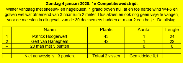 - Als men Niet Aanwezig is krijgt men de punten van de vissers zonder vis + 10 punten. - De 9 beste resultaten van de 12 competitiewedstrijden tellen mee voor de Eindstand (dus de 3 slechtste uitslagen vervallen, bv. als men niet aanwezig was).